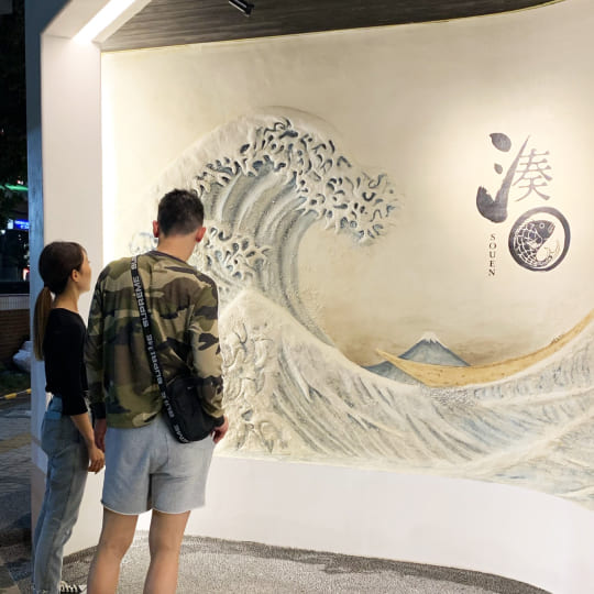 葛飾北斎の荒波をモルタルで表現。和食店のコンセプトとマッチし、SNS投稿も増えたとのこと。