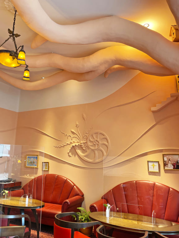 モルタル造形を施したのは店内の壁一面。それが外からガラス越しに見えることで足を止める通行人が続出。店 内なのに看板より目を惹く!それがモルタル造形です。